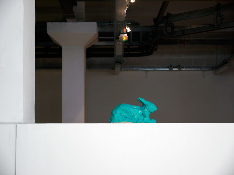 Le Lapin Turquoise (The Turquoise Rabbit) is an exhibition based on the reminiscences of spaces or geographical situations which convoke a museum like world. The works are installed in a dark exhibition space and define respectively their presentation place through the way they are enlightened. This exhibition has been conceived after a three months' residency in New York, in 2010. The show is articulated around three specific projects : Monsieur Pigman, the Ghost Dresses and Le lapin Turquoise.
