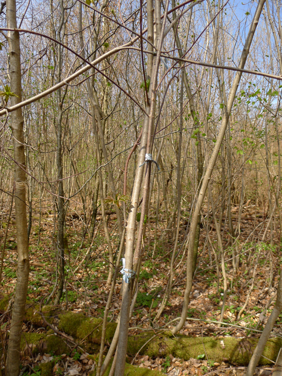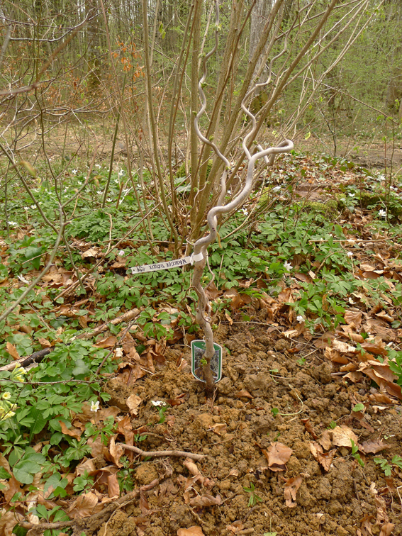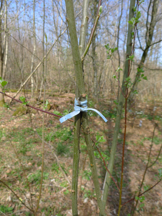 Greffe par approche entre un noisetier commun et un noisetier tortueux planté, caoutchoux et mastic à greffer sur bois / Grafting, rubber and grafting mastic in between a common hazel tree and a tortuous hazel tree