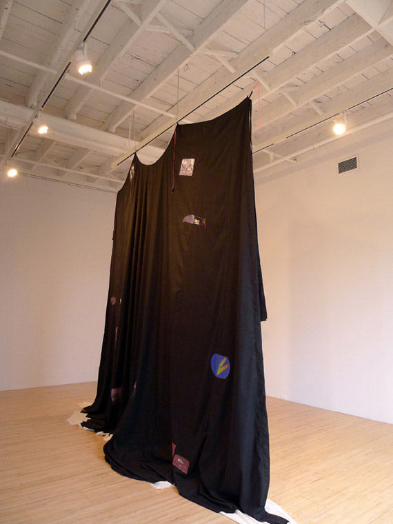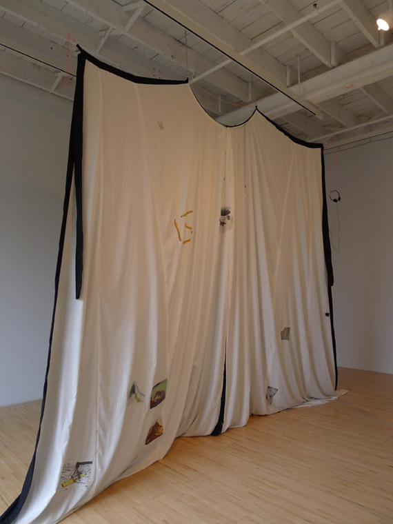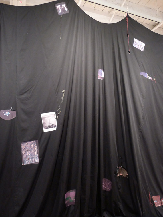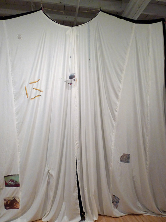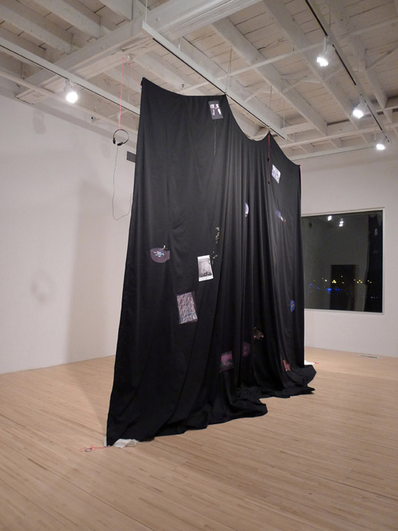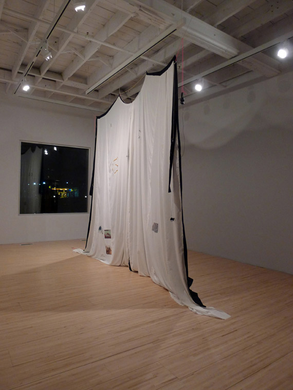 There is undoubtedly little to connect the disappearance of flight MH 310 off the coast of Australia with the position of NASA’s Curiosity Mars rover on 25 January 2014 at first glance; nevertheless, artist Ingrid Luche brings the two events together in an exhibition of the fruits of her residency at AXENÉO7 artist-run centre. In fact, she combines them in a complex imaginary space, a synthesized present situated somewhere between memory and anticipation. Suspended in the centre of the room like a sleeping bat, an immense cape divides the space in two—before and behind the great veil, depending on the viewer’s position. It serves as a transition point between black and white, night and day, past and future, and as witness to a troubling ghostly vision.
