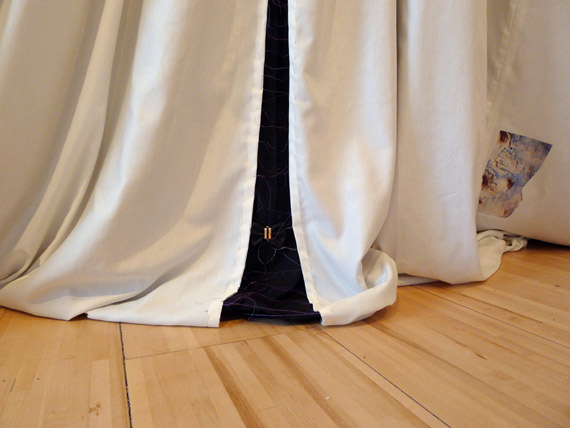 At the same time, the cape acts as a space in its own right, one which supports a kind of projection that appears through a network of iron-on transfers. A range of images drawn from international news stories as well as the reality of Vieux Hull appears on the cape’s surfaces like Amerindian embroideries. They lend symbolic significance to the cape as a document, and the cape itself endows a fantastical identity to whoever wears it. It is, in this respect, akin to the Dakota Ghost Dance dresses from which the artist drew inspiration.