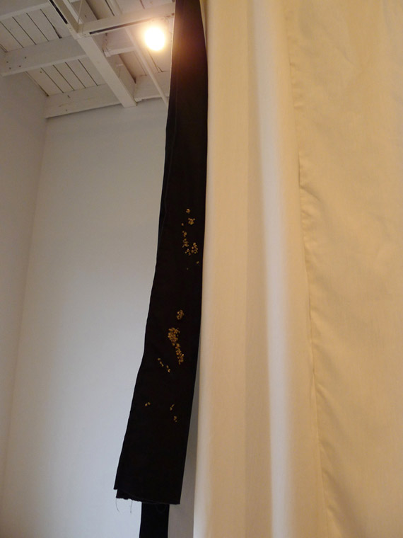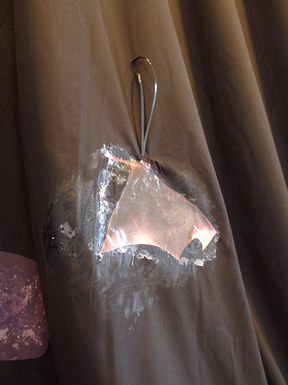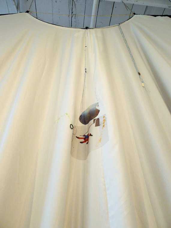 Cette œuvre a été réalisée à Axeneo7, Gatineau/Québec, où j’ai résidé et exposé en 2014. Cette grande aile habille en quelque sorte l’espace. Sa forme entre la robe et la cape revêt plusieurs rencontres temporelles dont la disparition du vol MH 370 en mars 2014 parallèlement aux télé-activités du robot Curiosity sur Mars, dans un contexte de production à l’heure du dégel au Canada.