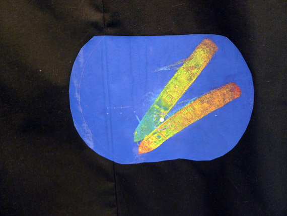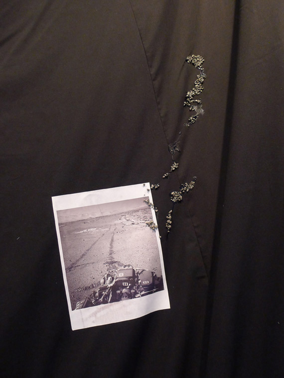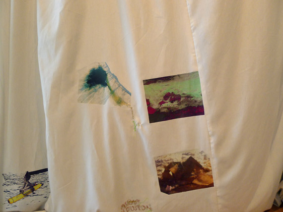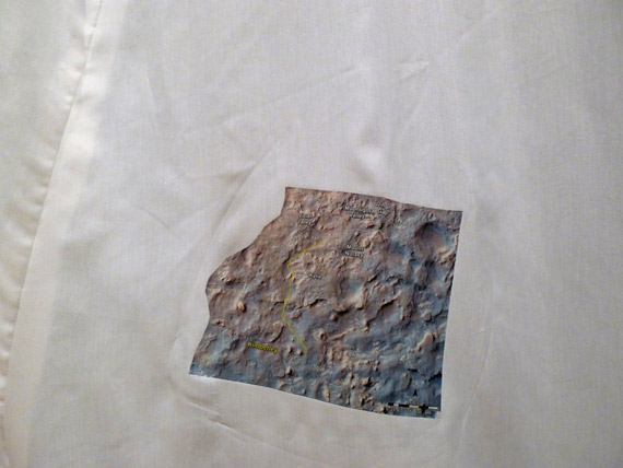 Cependant, la cape elle-même s’affirme comme un lieu : celui d’une certaine forme de projection dont l’aspect se traduit par un réseau de décalcomanies appliquées au fer chaud. La collection d’images hétéroclites puisées tant dans l’actualité internationale que dans la réalité concrète du vieux Hull se déploie sur les faces de la cape comme des broderies amérindiennes. De la même façon, elles agissent comme une sorte de documentation symbolique, car la cape est aussi le siège de l’identité fantasmatique dont se revêtirait la personne qui la porterait. À cette enseigne, elle agit effectivement à la manière des robes de la danse des esprits Dakota, les Ghost Dance dresses qui sont à l’origine du travail que propose l’artiste. C’est bien à une sorte de danse, en vérité, qu’est convié le regardant qui doit refaire dans son propre imaginaire un tracé complexe pour relier les fragments épars et disparates d’un monde écartelé par les réseaux de communications instantanés, sources d’une fiction reconstruite dont on se pare quotidiennement. Entre l’exploration martienne, espace des nouvelles conquêtes, et la désintégration annoncée, espace de perdition tragique, les parcelles de territoire se rejoignent-elles dans la construction d’une pensée mythique ? L’espace du voyage, funeste ou fabuleux, est ici proposé comme une boucle, un parcours entre l’intérieur et l’extérieur qui se replie sur lui-même, comme l’éternel retour nietzschéen.