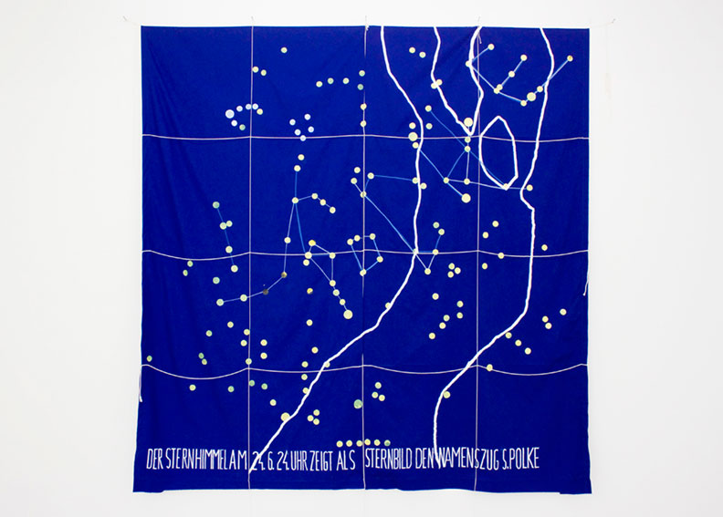 Parmi les œuvres produites à l'occasion de cette exposition une autre espèce s'est invitée, cosmique cette fois. «Maquette pour une robe à partir de l'œuvre Sternhimmeltuch (1968) de Sigmar Polke, paraphée I. Luche» n'est pas seulement le déploiement et l'emprunt d'un titre énigmatique, c'est aussi la reproduction d'une constellation d'étoiles -du système solaire- dans lesquelles Sigmar Polke écrivit son nom en 1968. Ingrid Luche superpose aujourd'hui le sien et transforme ainsi ce tissu spatial en nouvelle-née de la série des «Ghost Dresses». Et pourquoi ne pas se parer à présent de ses astres ?