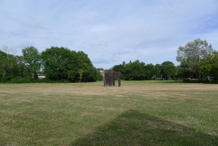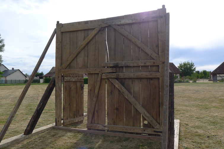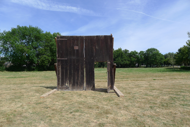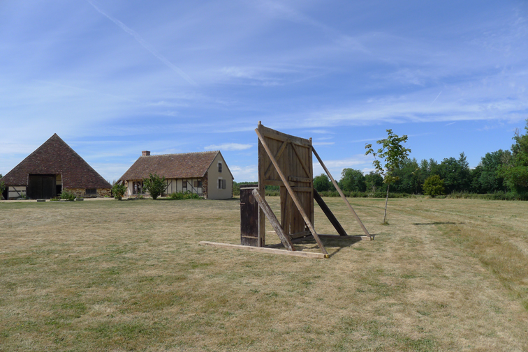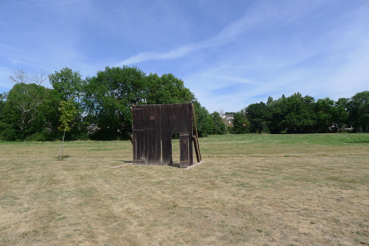 Wood door stemming from a pyramidal barn characteristic from local architecture, installed in a Vailly-sur-Sauldre meadow. La Porte d’Optat has the name of the foremother first name of whom belong this barn. These barns, the more often relieved of their original functions -when the agricultural activity has been modified, the equipment has no more the pre-existing built norms or/and when their restoration conditions have being too expensive- seems to extend a time other.