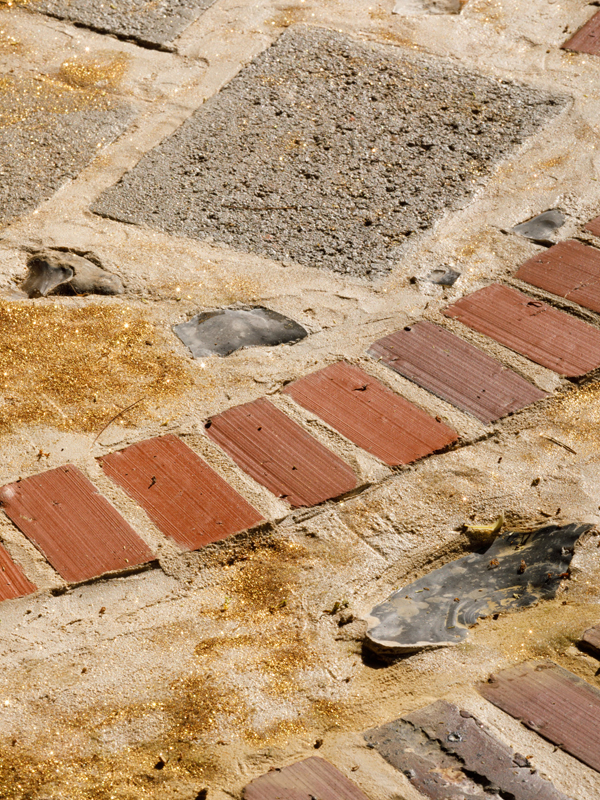 glazed terracotta bricks, concrete blocks, natural mortar, flint, gold glass microbeads and