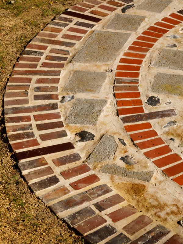 suit une zone engazonnée dans des trapèzes de béton, plus loin quelques éléments