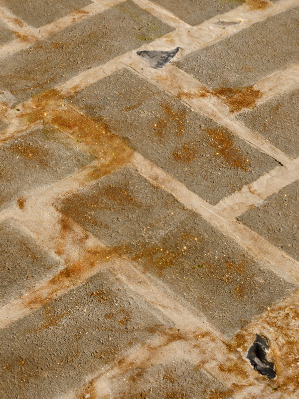 béton, mortier naturel, silex, microbilles en verre « gold » et paillettes / Terracotta and